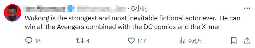 “孙悟空是有史以来最强大、最不可战胜的虚构角色。所有复仇者联盟、X战警和DC的漫画角色加一起也打不过他!”