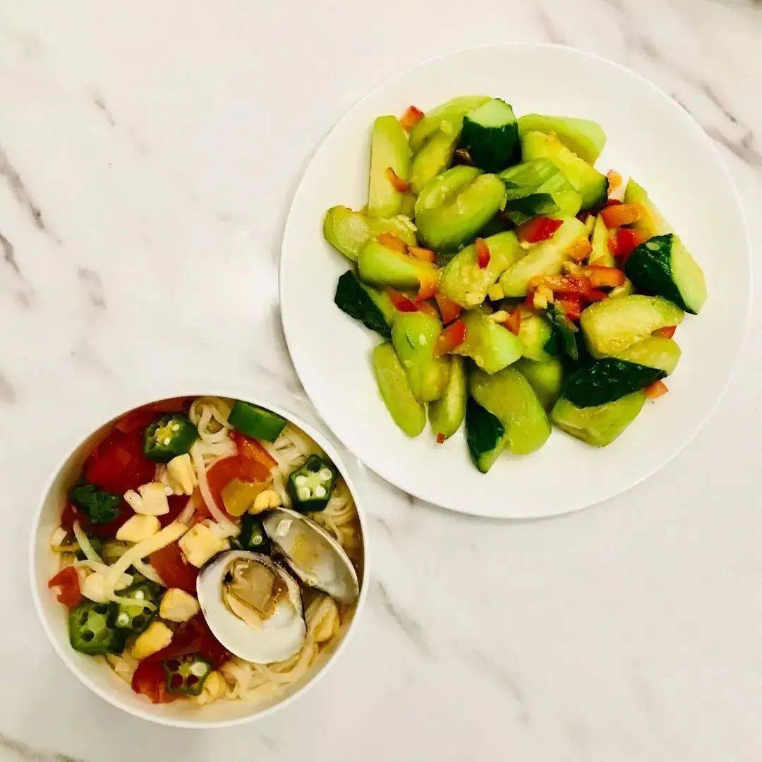 然后放入西红柿,水开再放入秋葵和面条,面条是先用另外一个锅煮熟的,分开煮还是不想大火煮面把海鲜煮老了,最后加点盐和白胡椒粉就出锅了。