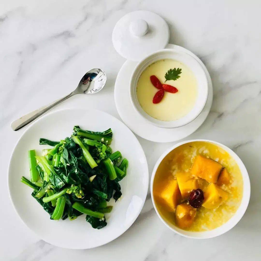 杂粮饭、蒸鸡蛋羹、凉拌菜心