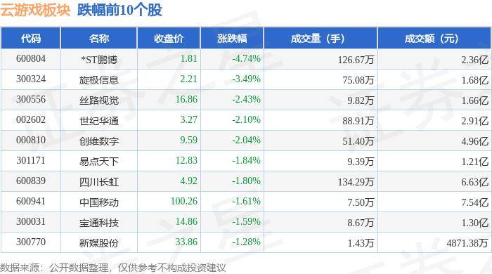 证券之星消息,9月9日云游戏板块较上一交易日下跌0.69%,*ST鹏博领跌。当日上证指数报收于2736.49,下跌1.06%。深证成指报收于8063.27,下跌0.83%。云游戏板块个股涨跌见下表: