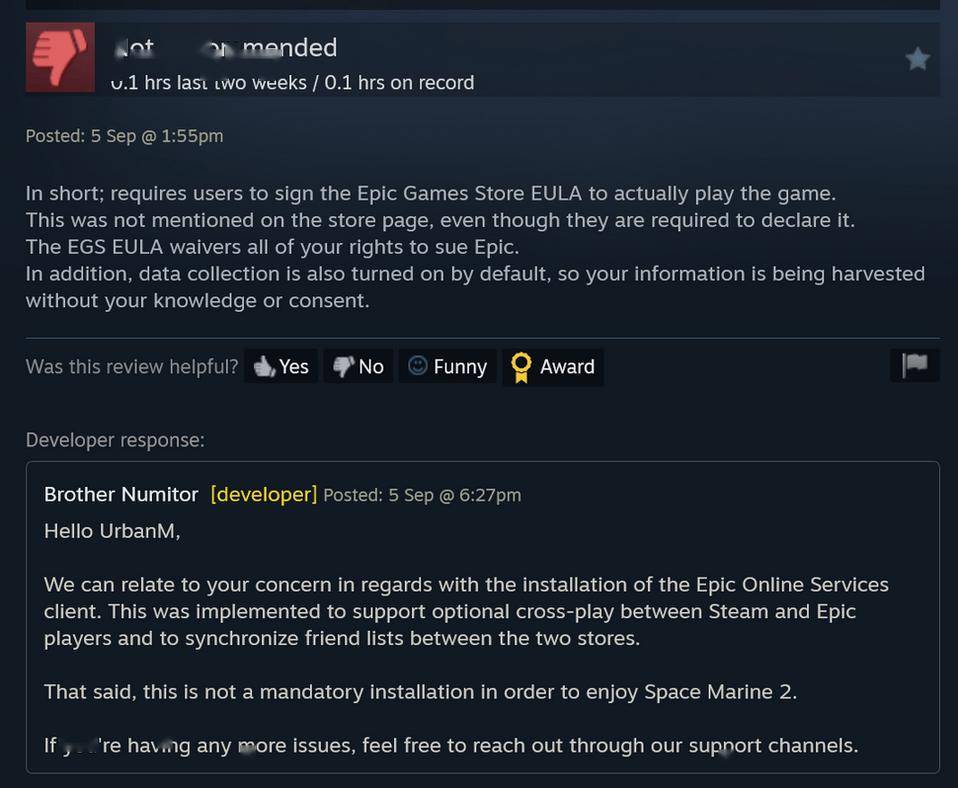 在 Steam 上的一篇差评下,开发者也回应确认玩家可以选择删除 Epic 线上服务,但删除它意味着玩家将无法和 Steam 以外的其他平台进行联机,并且“可能会在其他游戏中导致其他不可预见的问题。”