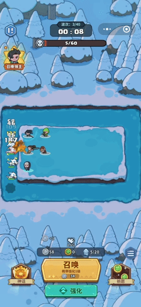 简单来看,该游戏融合了111%最擅长的合成+塔防玩法,玩家可用联机匹配和邀请好友两种途径开启关卡,然后通过召唤、合成英雄的方式,双人合作对抗怪物和Boss,当场上敌人数量超过一定限额或者Boss存活时间过长,则游戏结束进行奖励结算。