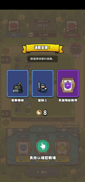在召唤出英雄之后,玩家可以直接让英雄上阵,也可以选择进行升星挑战,在挑战的时候对应英雄有一定的概率会提升或降低一颗星,而且这个挑战可以无限进行下去。搏一搏,单车变摩托,一星的英雄可以通过多次挑战升到四星,不过一个四星英雄也有可能会因为玩家的贪心降到一星,这种玩的就是心跳的设计,非常容易让人上头。在战斗过程中,玩家还有可能触发三选一的肉鸽选项,增加输出还是提升关卡奖励,就在一念之间。