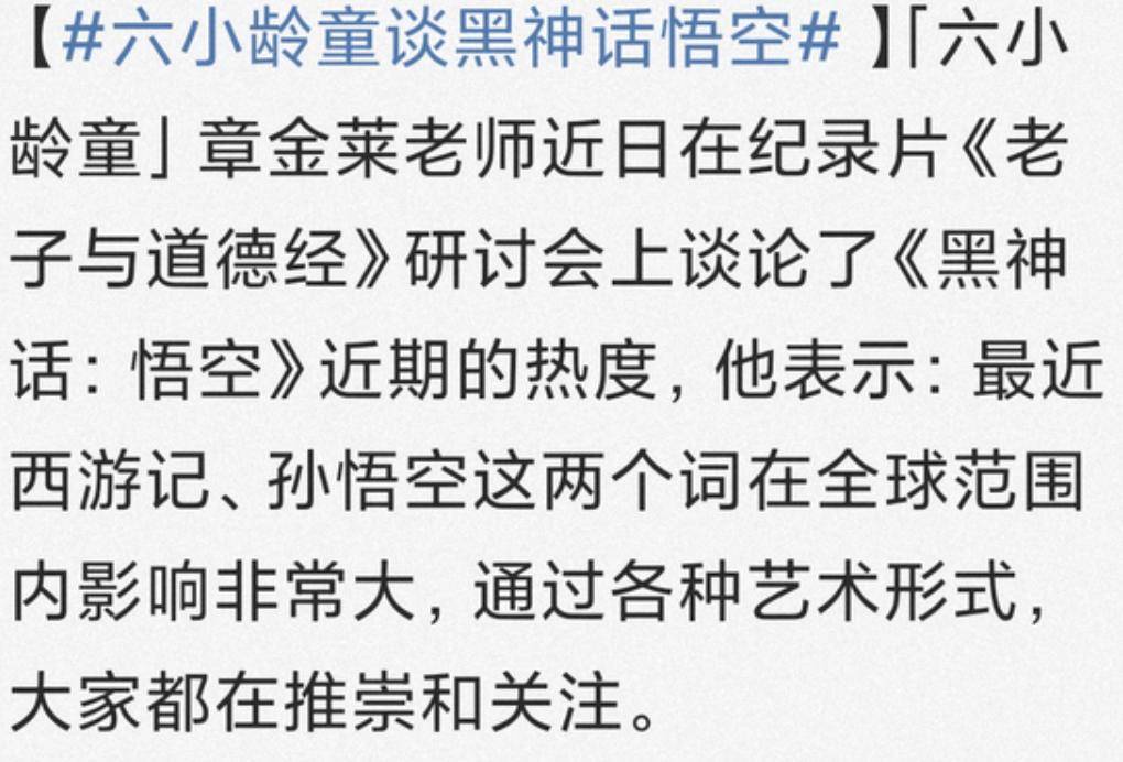 近日,在备受瞩目的《老子与道德经》纪录片研讨会上,艺术界泰斗六小龄童章金莱老师,悠然谈及到了游戏界的新星《黑神话:悟空》,而他的言语也引发了广泛热议。此次发言,不仅是六小龄童老师首次公开就这款现象级游戏发表见解,更是传统文化与现代游戏文化跨界碰撞的一次微妙回响。