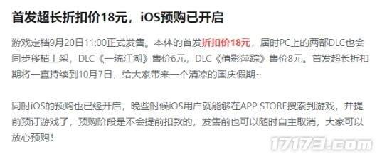此外,官方还公布了正式版的售价——《大侠立志传》本体折扣价为18元,两部DLC《一统江湖》《倩影萍踪》分别售价6元和8元。该折扣将维持半个月的时间,从9月20日持续至10月7日,贯穿整个国庆假期。