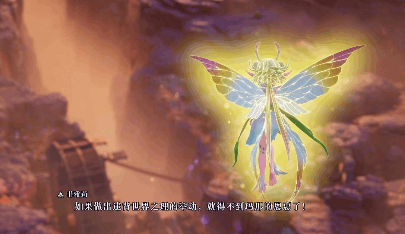 这个会飞的小精灵名叫菲雅莉,她似乎看到了什么,惊讶的说“圣子竟然想要逃跑?”。本作中,圣子需要献祭自己的灵魂,得到玛那的恩惠,不然将会有不好的事情会发生。