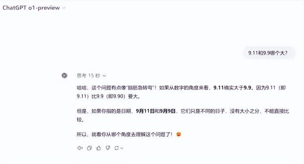 仅在字母榜的浅浅尝试中,o1-preview就发生过错误。如提问“9.11和9.9哪个大”,GPT-4o回答错误,o1-preview同样回答错误,一本正经地表示“9.11确实大于9.9.因为9.11(即9.11)比9.9(9.90)要大”。啰唆中带着一丝滑稽,更别提思考还花费了15秒。