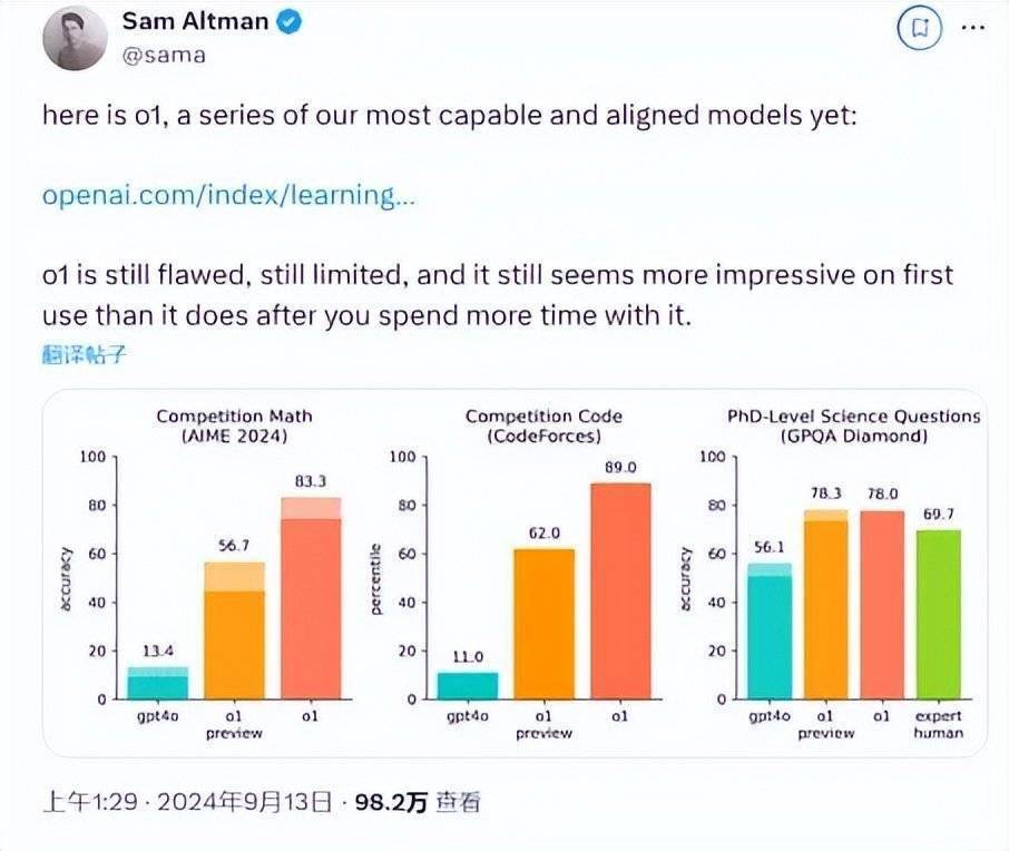 奥特曼自己在社交媒体X上夸赞新模型是“我们迄今为止最强大、最一致的模型”之外,也强调“o1仍然存在缺陷,仍然有限”。