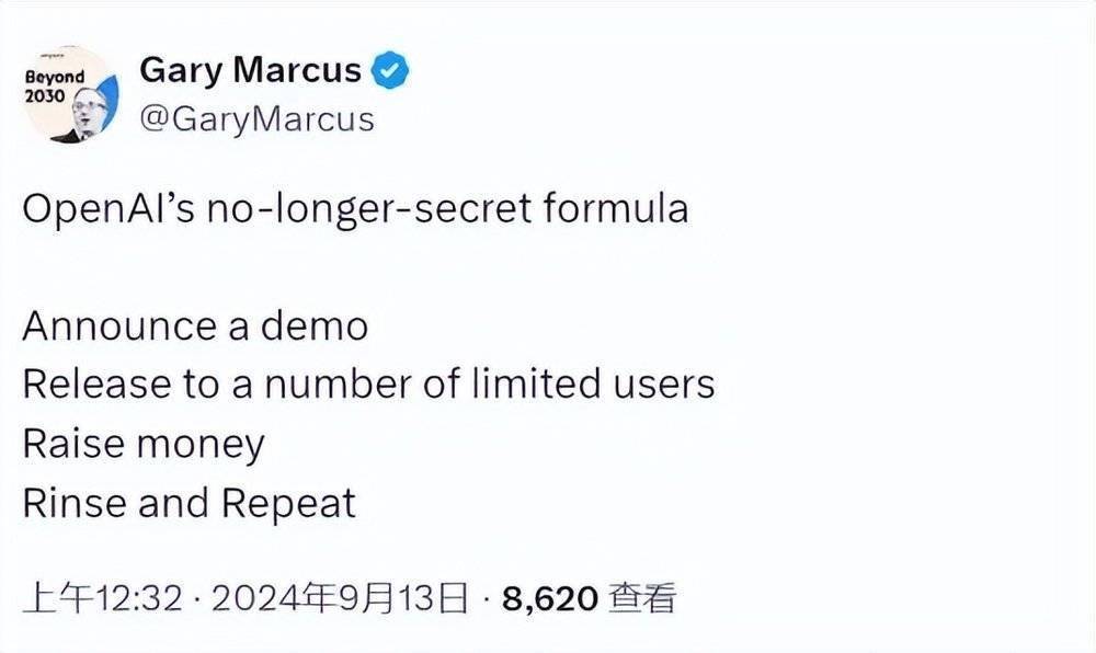 “发demo,向有限用户开放、筹钱、重复”,马库斯这样总结OpenAI的“手段”。