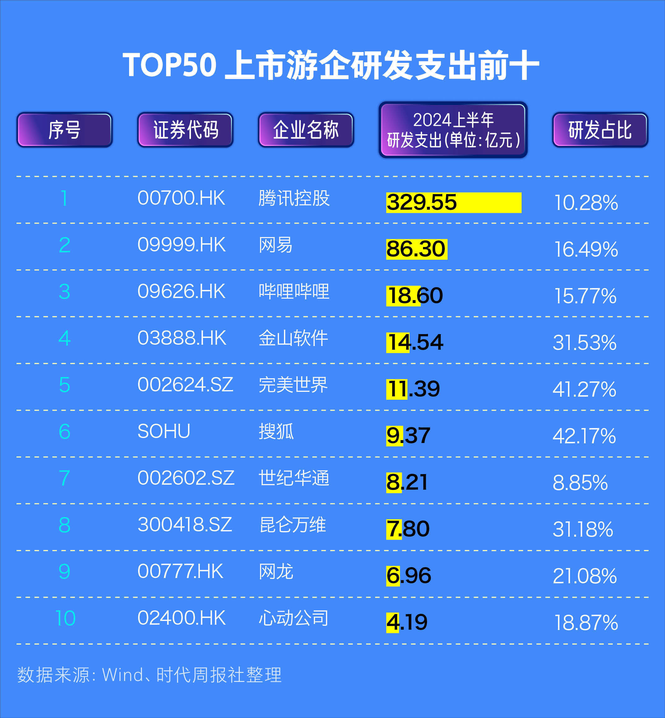 据时代周报记者统计,中国TOP50上市游戏企业2024上半年累计研发投入(注:未剔除非游戏业务研发投入)突破500亿元,达到541.2亿元,中位数为1.1亿元。其中,腾讯控股(00700.HK)2024上半年研发投入为329.55亿元,位居第一;此外,家乡互动(03798.HK)、疯狂体育(00082.HK)尚未披露2024上半年研发投入。