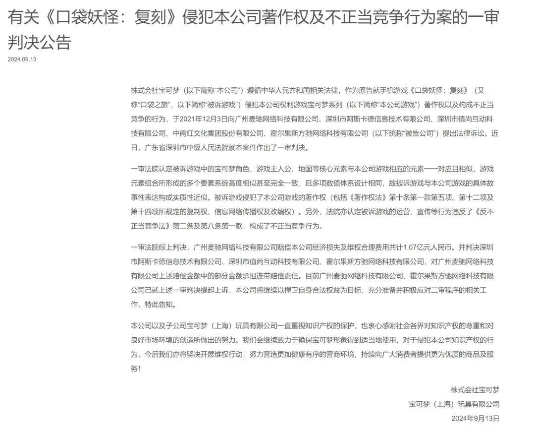 广东省深圳市中级人民法院裁定宝可梦公司胜诉,被告方需向宝可梦公司赔偿共计1.07亿元人民币的损失。