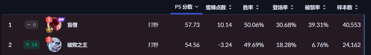 打野位热门英雄:盲僧(OP英雄)、破败之王