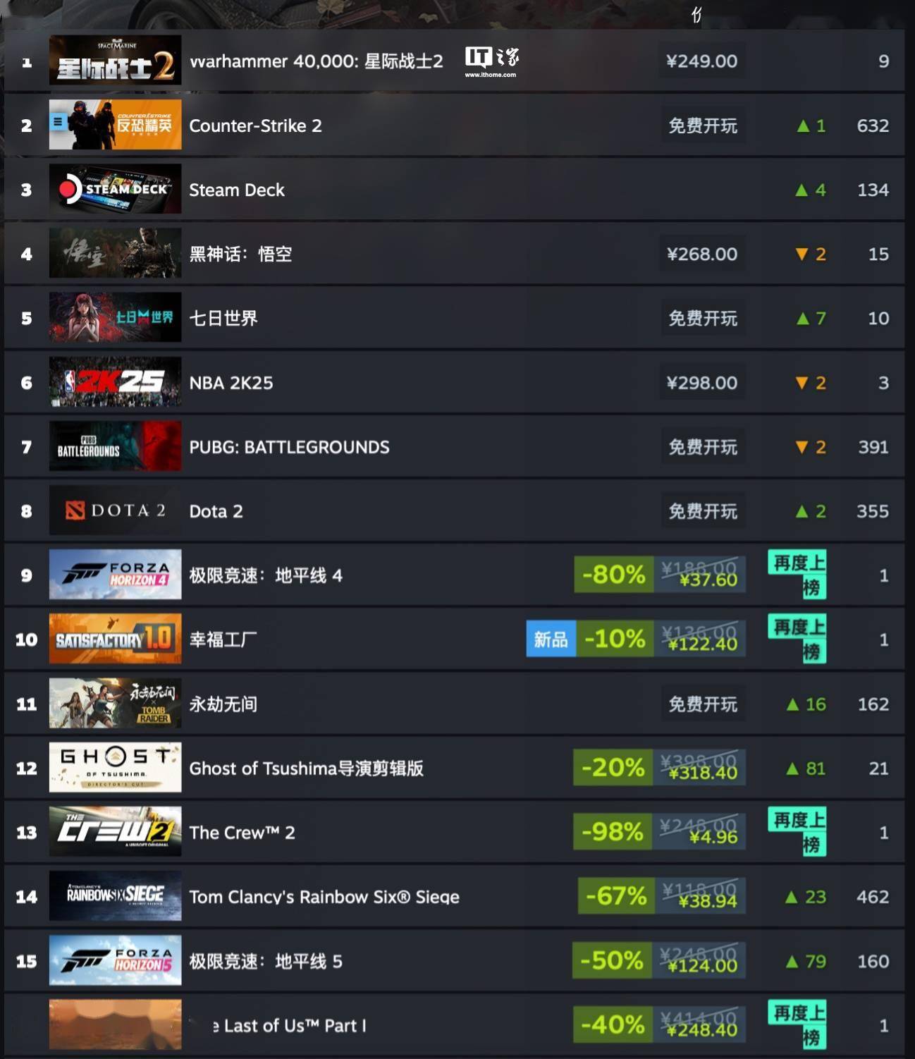 IT之家附 Steam 新一周销量榜(排除免费游戏内容和 Steam Deck):