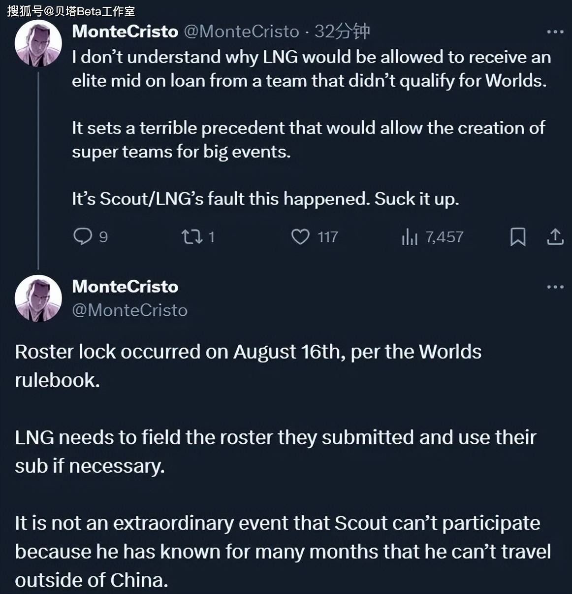只是想要拳头通过,难度很大,因为Scout和EDG的官司在4月份就有了新的进展,当时就禁止出境了,这么长时间没有解决,影响到世界赛的参加,如果其他战队也这样效仿,都利用这个规则在世界赛补强的话,后面比赛会很难办。看规则应该是不合规的,除非拳头特批,但是如果特批,肯定会有很大的舆论风波。因为在外网上已经有前LCK解说公开反对LNG租借中单,因为这件事情是LNG和Scout的错误,他们几个月前就知道了这件事情,不能为此开创先例。