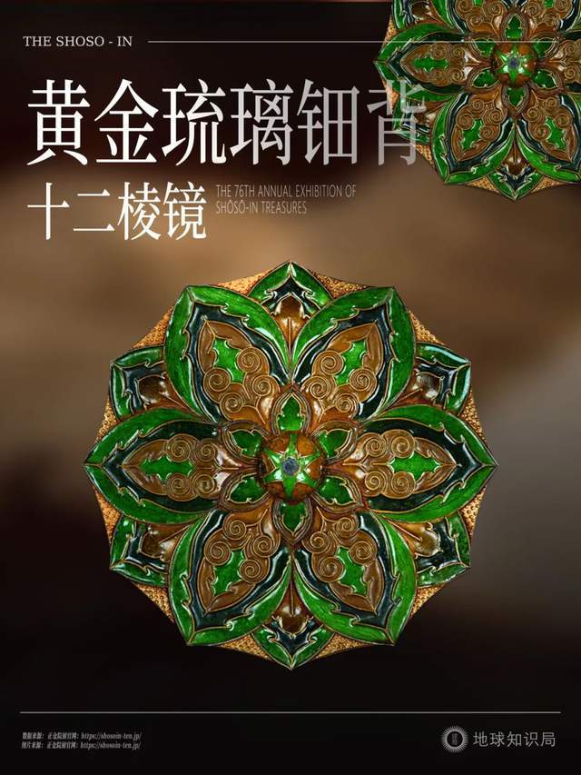 例如今年正仓院大展官方宣传图所使用的文物——“黄金琉璃钿背十二棱镜”,只用三种颜色的珐琅就构造出极为复杂的层次,形成三朵同心交织的宝相花。